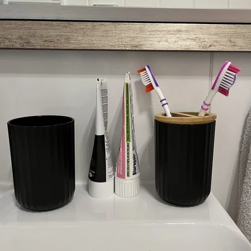 • Cana pentru periuțe de dinți și pahar pentru clătire cu capac din bambus