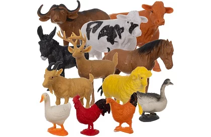 • Include 12 animale de fermă – oaie, cal, 2 rase diferite de vaci, capră, măgar, găină, rață, bivol, gâscă, cocoș, cerb