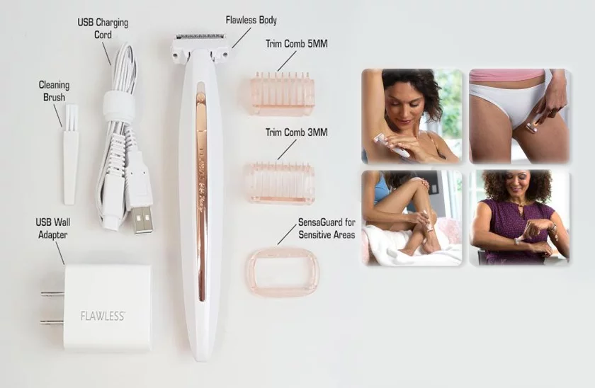 Îndepărtează rapid și fără dureri părul de pe orice zonă a corpului. Aparatul de ras Flawless Body îndepărtează rapid și fără dureri părul de pe subraț, mâini, picioare, de pe zona inghinală sau de oriunde de pe corp.