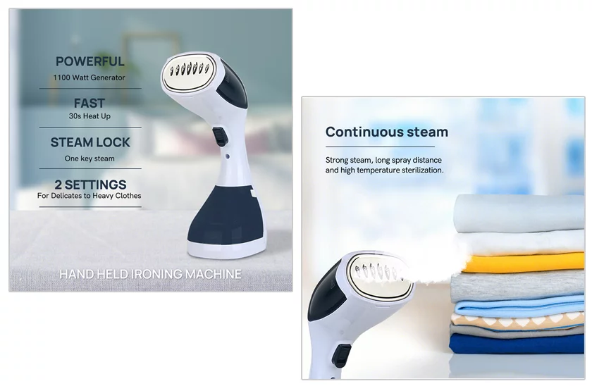 Acest aparat cu aburi va da ținutei dvs. un aspect proaspăt în doar câteva momente. Este un ajutor ideal pentru diminețile agitate. Spuneți adio luptei cu masa și cu fierul de călcat. Aparatul portabil cu aburi nu numai că poate netezi cutele hainelor dvs., ci veți putea cu el călca perdelele fără a le da jos de pe galerie sau să îl folosiți pentru canapele și pentru lenjeria de pat. De asemenea, calcă foarte bine hainele aflate pe umerașe.