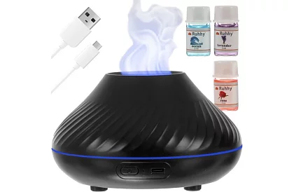 Elegant difuzor de aromă 3 în 1 combină umidificarea aerului, aromaterapia și iluminarea decorativă RGB cu efect de flacără. Ajută la îmbunătățirea calității aerului, la crearea unei atmosfere liniștite și la susținerea relaxării și unui somn mai bun. Datorită funcționării silențioase și consumului redus de energie, este ideal pentru dormitor, living, birou și cameră de copii.