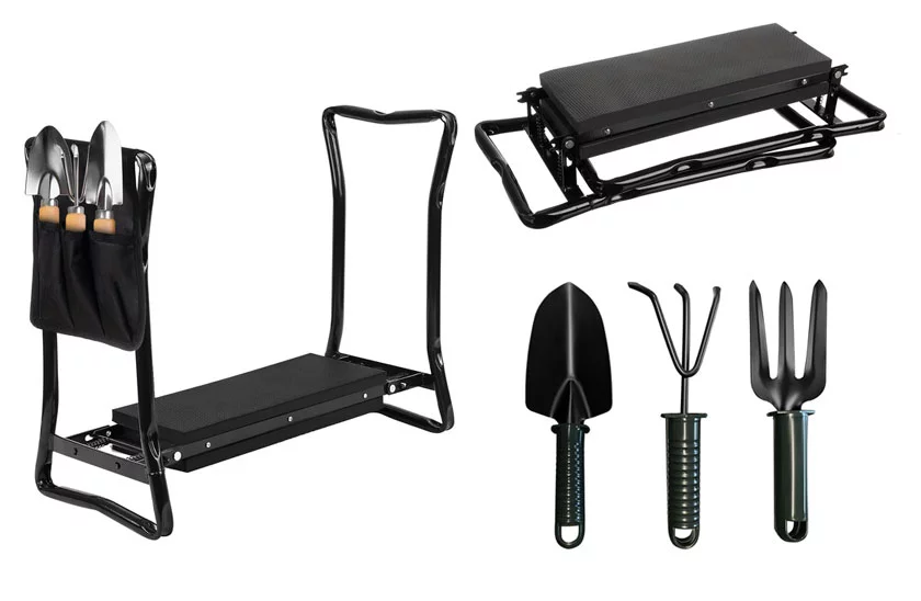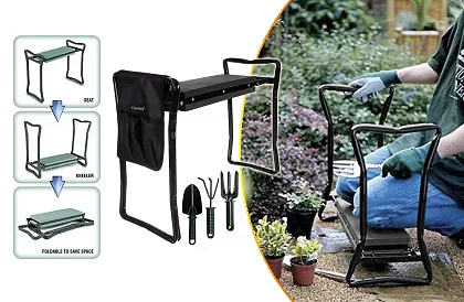 Are un cadru metalic rezistent cu o capacitate de până la 120 kg, oferind stabilitate chiar și pe terenuri denivelate. Blocajele laterale asigură utilizarea în siguranță fără riscul de pliere accidentală. Pachetul include și un organizator practic pentru unelte, plus un set de unelte de bază pentru grădinărit – toate la îndemână.