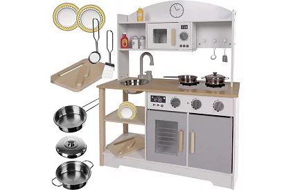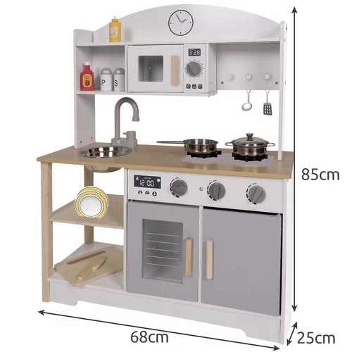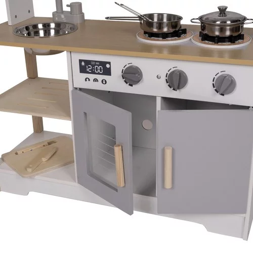 O bucătărie din lemn fantastică, care încurajează imaginația copiilor, sprijină creativitatea și permite ore de distracție în timpul jocului de gătit. Ceasuri analogice, butoane mobile, uși care se deschid și un chiuvetă detașabilă oferă o experiență realistă, care îi învață pe copii independența și bazele gătitului. De asemenea, sunt incluse accesorii practice care imită un mediu de bucătărie real.