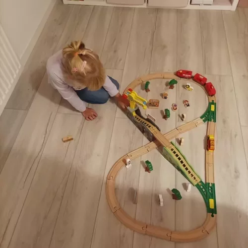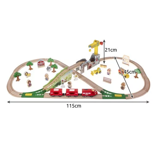 Setul mare de cale ferată din lemn oferă 57 de elemente atent fabricate și finisate în detaliu, cu care copilul poate construi propriul său traseu și peisajul din jur. Conexiunea magnetică a trenurilor asigură o legătură sigură și fermă, în timp ce accesoriile precum copacii, clădirile, figurinele și macaraua stimulează creativitatea și orele de distracție.