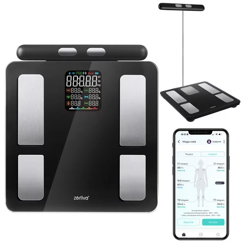 • Alte măsurători: IMC, grăsime subcutanată, masă musculară, mușchi scheletici, proteine, apă, metabolism bazal și activ, grăsime viscerală