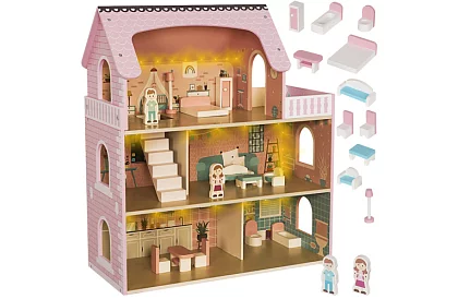 Casa de păpuși din lemn mare cu 3 etaje oferă spațiu pentru o joacă creativă nesfârșită. Construcția solidă din lemn fin prelucrat asigură siguranța și o durată lungă de viață. Datorită setului bogat de mobilier, este pregătită pentru joacă imediată fără necesitatea de a cumpăra accesorii suplimentare. Iluminarea LED integrată conferă casei o atmosferă realistă și transformă joaca într-o experiență magică chiar și în orele de seară. Ideal ca un cadou care combină distracția, fantezia și dezvoltarea creativității copiilor.