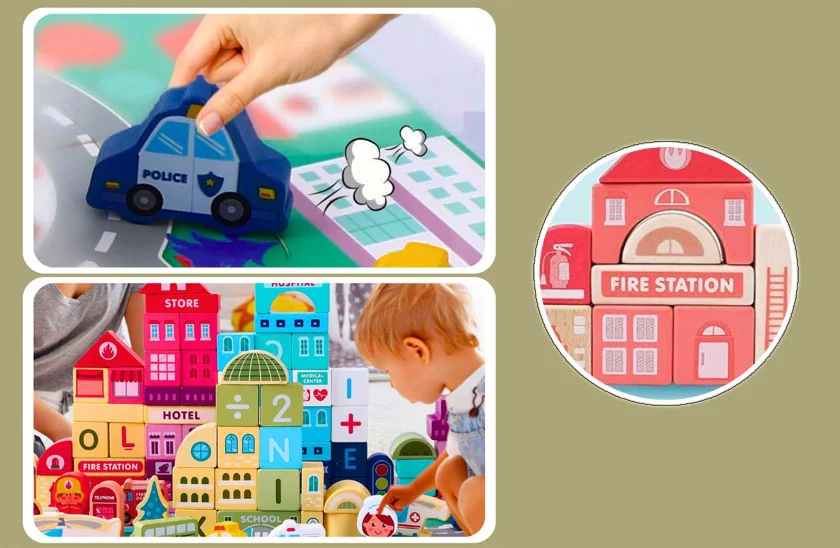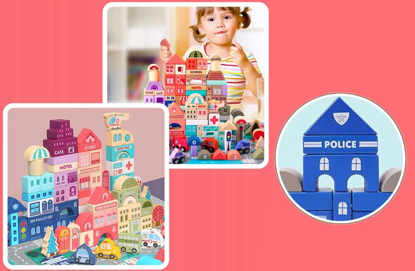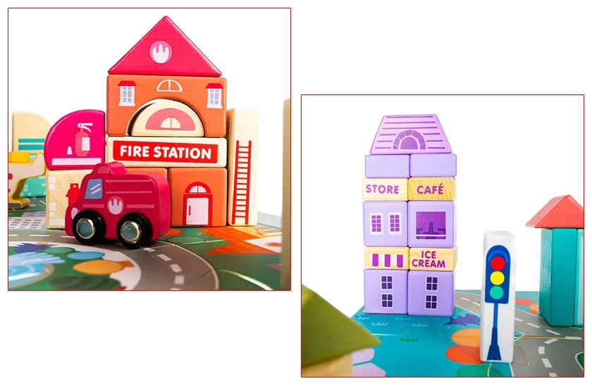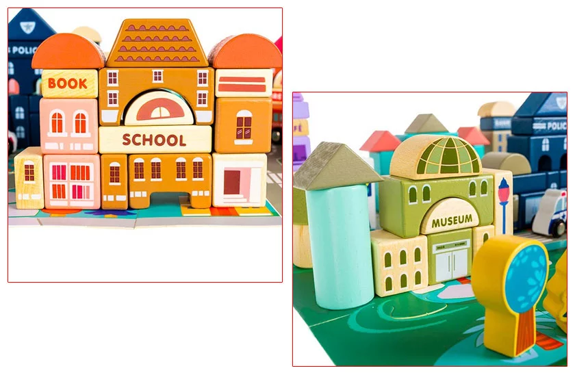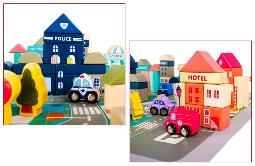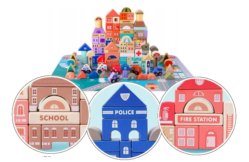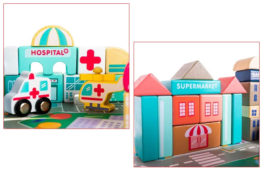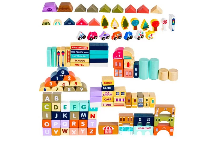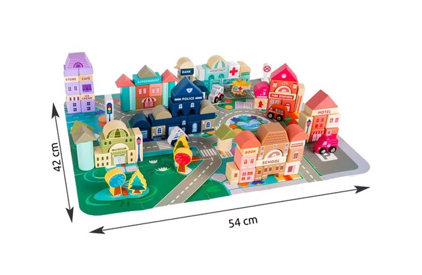 Construiți-vă propriul oraș plin de fantezie și aventură! Cu acest set mare de căsuțe din lemn, copiii pot crea un oraș după imaginația lor – de la bancă, școală, spital până la vehicule de salvare. Distracție grozavă care nu doar că este amuzantă, dar și educativă!