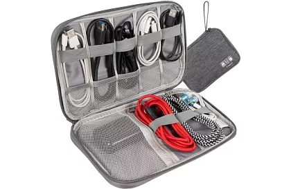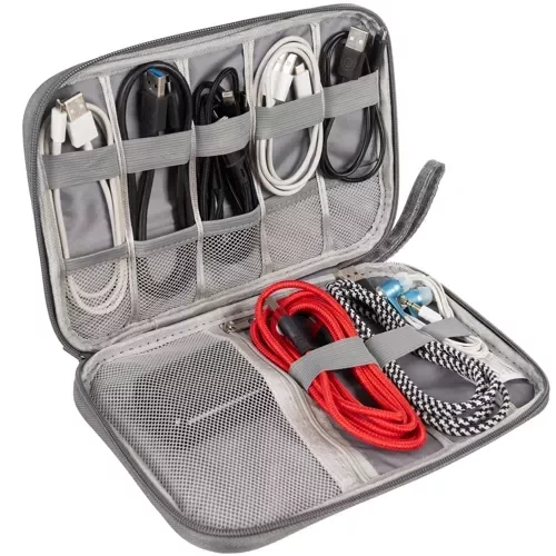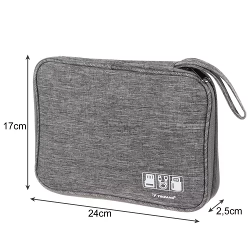 Organizatorul permite stocarea ordonată și sigură a cablurilor, încărcătoarelor și a micii electronice. Datorită materialului rezistent la apă, lucrurile dumneavoastră sunt protejate împotriva umidității și a vărsărilor accidentale. Dimensiunile compacte și mânerul practic pentru transport facilitează călătoriile, la birou sau la întâlniri, iar numărul mare de compartimente și elasticuri permite sortarea perfectă și accesul ușor la electronică. Fermoarul asigură o închidere estetică și sigură și elimină dezordinea cauzată de numărul mare de cabluri.