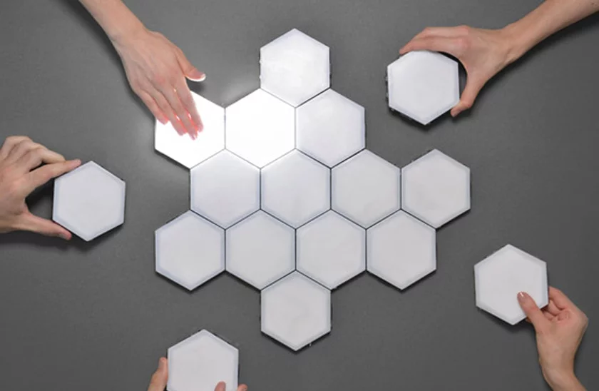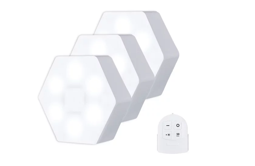 Set de 3 lămpi LED wireless, cu un sistem modular inovator în formă de hexagon și cu telecomandă. Singuri decideți de câtă lumină aveți nevoie. Fiecare lampă funcționează separat. În funcție de cum aveți nevoie, puteți aprinde și opri lămpile așa cum doriți printr-o singură atingere sau le puteți controla prin intermediu telecomenzii livrate. Lămpile pot fi combinate pentru a crea diferite compoziții.