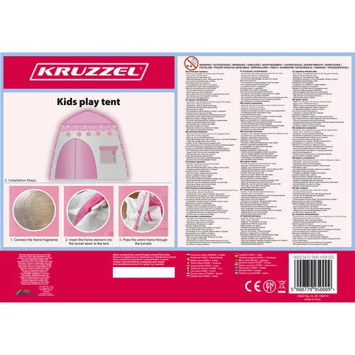 Construcția stabilă și materialul rezistent garantează o joacă sigură. Cortul este echipat cu podea și fabricat dintr-un material sintetic de calitate, rezistent la deteriorare. Pachetul include și găleată luminoasă cu 20 de bile din bumbac alimentate de 2 × baterii AA (nu sunt incluse), care aduce o lumină caldă plăcută atât în interior, cât și în exterior.