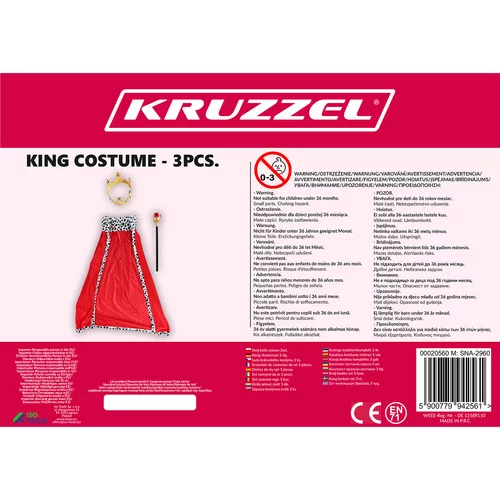 Costumul regal cu mantie, sceptru și coroană permite fiecăruia să devină un adevărat suveran. Mantia roșie fluturând cu blană alb-negru, sceptrul măreț cu o piatră prețioasă roșie și coroana decorată cu cristale colorate creează o aură inconfundabilă de autoritate și eleganță. Ideal pentru petreceri cu costume, spectacole de teatru, aniversări sau evenimente școlare.