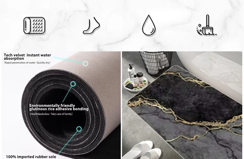 Acest covoraș absorbant cu uscare rapidă poate fi folosit nu doar pentru baie. Va putea decora orice încăpere din casa dvs. Covoraș extrem de confortabil, nu numai pentru baie, fabricat din spumă cu absorbantă inovatoare. Protejează eficient împotriva podelelor reci și oferă confort la ieșirea din cadă sau duș. Stratul anti-alunecare împiedică alunecarea.