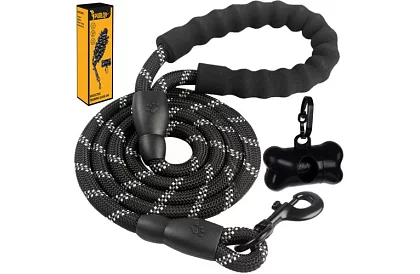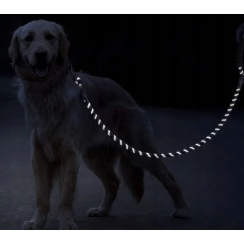 Curea din sfoară rezistentă concepută pentru plimbări sigure și confortabile. Lungimea de 3 metri oferă câinelui libertate de mișcare, în timp ce sfoara puternică din polipropilenă și carabină metalică asigură un control fiabil. Elementele reflectorizante pe întreaga lungime cresc vizibilitatea în condiții de întuneric și mânerul din spumă protejează mâna chiar și în cazul unei trageri mai puternice. Un bonus practic este recipientul cu pungi pentru excremente întotdeauna la îndemână.