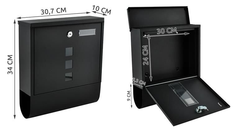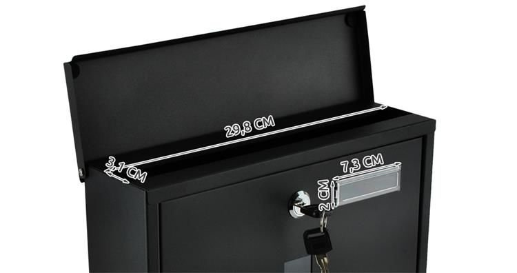 Cutia poștală este fabricată din otel zincat, astfel încât nu ruginește și rezistă multe sezoane. Este echipată cu un capac care protejează corespondența de intemperii și cu un tub pentru ziare și pliante. Setul include dibluri de montaj și șaibe pentru o fixare ușoară pe perete și două chei pentru închidere sigură.