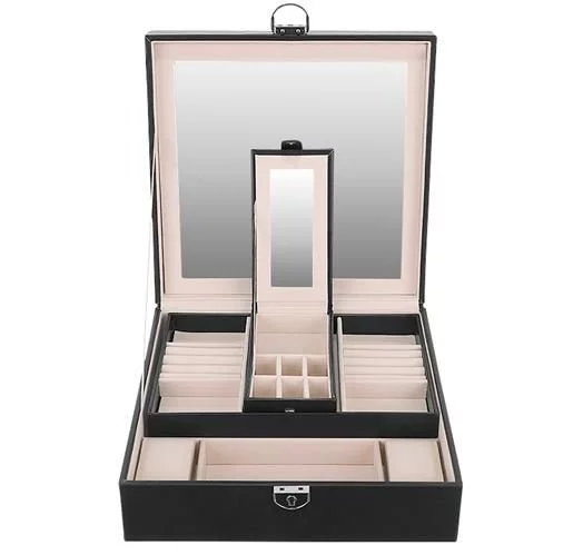 Capacitate mare – cutia de bijuterii oferă un capac detașabil cu 2 compartimente cu role pentru inele, 4 compartimente pentru alte bijuterii și o cutie detașabilă. În partea de jos sunt 6 compartimente suplimentare, 2 inserții pentru ceasuri sau brățări și 1 compartiment mare pentru obiecte mai mari. Toate compartimentele sunt căptușite cu un material moale care protejează bijuteriile de zgârieturi.
