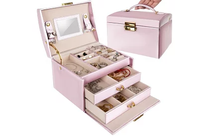 Cutia de bijuterii este o modalitate practică și sigură de a organiza și proteja bijuteriile, ceasurile, monedele și alte bunuri de valoare. Datorită 20 de compartimente, 3 sertare și nișe cilindrice veți avea totul organizat. Lacătul cu cheie asigură siguranța conținutului, iar suprafața satinată și detaliile elegante conferă cutiei de bijuterii un aspect luxos.