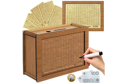 Pe fața din față este o tabelă clară a sumelor, pe care le bifați treptat până la atingerea obiectivului financiar ales. Economisirea devine astfel o provocare distractivă și motivantă, care ajută la construirea obiceiurilor financiare și la bucuria de a atinge un scop. Datorită 5 cardurilor interschimbabile, se pot stabili diferite obiective de economisire, astfel încât pușculița este potrivită atât pentru copii, cât și pentru adulți și servește excelent ca cadou original.