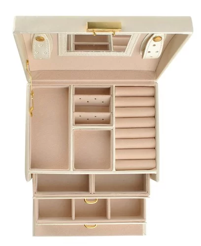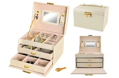 Cutia de bijuterii este o modalitate practică și sigură de a păstra bijuteriile, ceasurile, monedele și alte valori. Datorită mai multor compartimente, sertare și role, veți avea colecția organizată întotdeauna și lacătul cu cheie va asigura siguranța conținutului. Suprafața satinată bej cu detalii elegante conferă cutiei de bijuterii un aspect luxos.