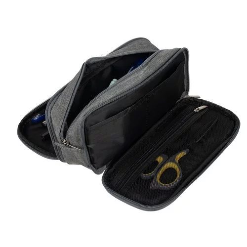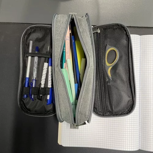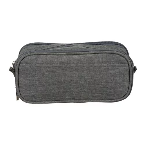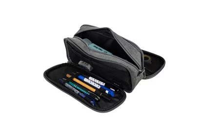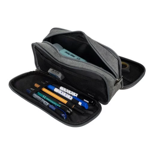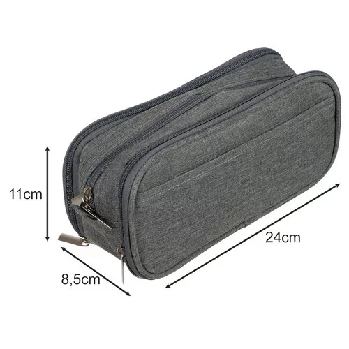 Pencil case tricompartimentat oferă spațiu, organizare și un design elegant. Datorită materialului rezistent din poliester și fermoarelor practice, permite stocarea confortabilă a articolelor școlare, de birou și de călătorie. Buzunarele exterioare asigură acces ușor la obiecte mici, carduri sau bilete, ceea ce crește practicitatea în utilizarea zilnică. Aspectul elegant gri permite utilizarea și ca pouch cosmetic.