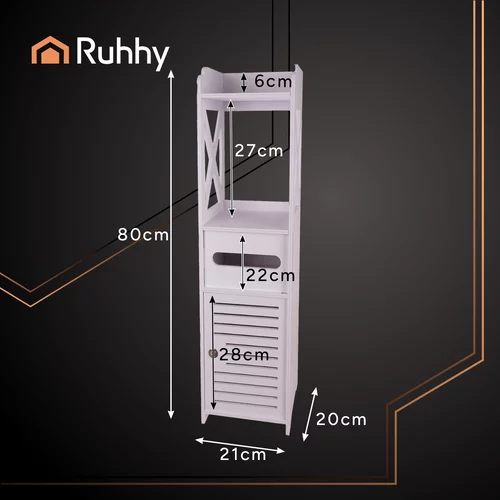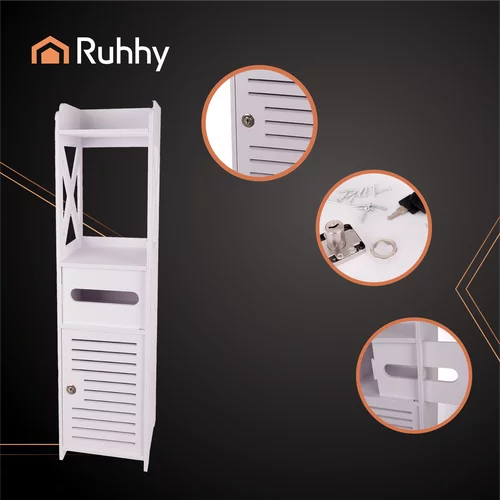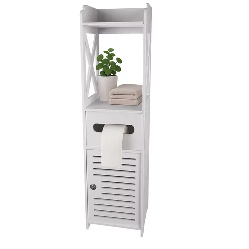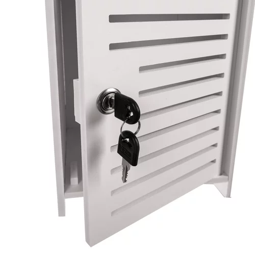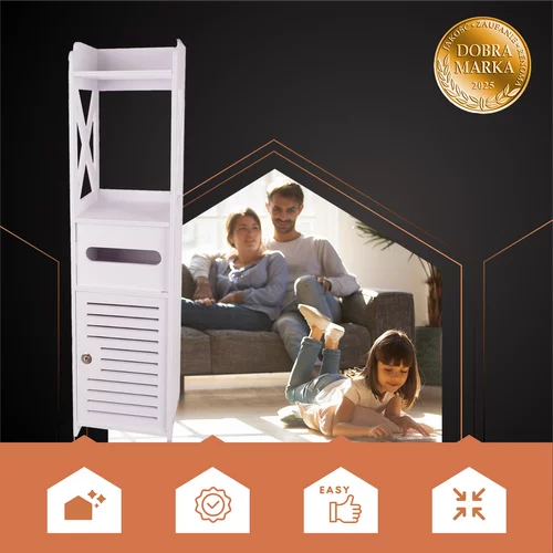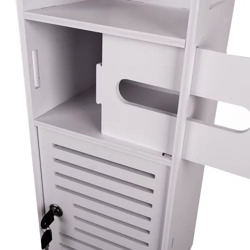 Un stâlp practic pentru baie de culoare albă elegantă va ajuta la menținerea ordinii chiar și în băile mai mici. Designul compact oferă suficient spațiu de depozitare pentru cosmetice, produse de curățare și hârtie igienică, în timp ce suportul încorporat permite utilizarea sa igienică și rapidă. Ușile perforate conferă dulapului un aspect ușor și modern și asigură în același timp o circulație naturală a aerului. Designul cu încuietoare protejează conținutul de copii și accesul nedorit.