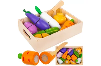 Setul colorat de fructe și legume din lemn aduce distracție și dezvoltare a motricității acasă și în călătorii. Copiii pot încerca tăierea cu un cuțit sigur și cu fermoar, și apoi să reunească legumele, ceea ce susține coordonarea, creativitatea și imaginația. Setul este ideal pentru joacă acasă, la grădiniță sau în timpul învățării culorilor, formelor și numărării. Datorită cutiei practice, este ușor de transportat și de depozitat, astfel încât este potrivit și pentru călătorii.