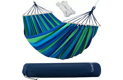 Hamaca confortabilă pentru două persoane este ideală pentru relaxare în grădină, pe terasă sau în interior. Fabricată din bumbac plăcut cu o cantitate mică de poliester, asigură confort și o ventilație corespunzătoare. Datorită barelor din lemn, se desfășoară ca un pat și permite întinderea liberă, cititul sau relaxarea. În pachet sunt incluse frânghii și o husă pentru o montare și transport ușor, astfel încât să vă puteți bucura de relaxare oriunde.