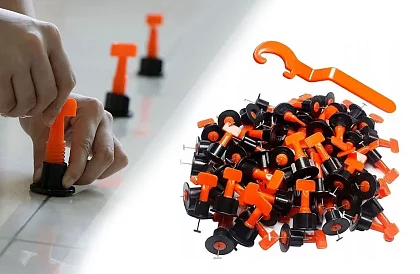 Acest instrument perfect pentru montarea gresiei este un instrument perfect de bricolaj, dar și pentru profesioniști Cu acest set de elemente de fixare speciale, montarea gresiei sau a faianței va fi o joacă, pe care o poți realiza singuri. Utilizarea este foarte simplă. Introduceți elementul de fixare între plăcile aranjate sau proaspăt lipite și strângeți piulița pentru a crea un plan drept. Elementul de fixarea poate fi scos după ce adezivul s-a întărit. Rezultatul va fi o suprafață placată frumos dreaptă.