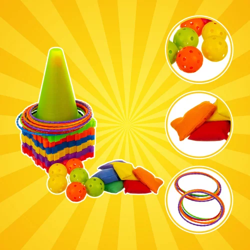 Dezvoltă coordonarea, abilitățile motorii și concentrarea prin mișcare distractivă. Conurile colorate, cercurile, mingile și gențile atrag atenția copiilor și le susțin jocul activ acasă, afară și în sală. Setul este potrivit ca cadou, care combină învățarea cu joaca și îi motivează pe copii să revină la joc din nou și din nou.