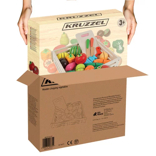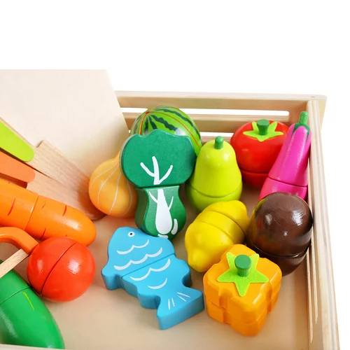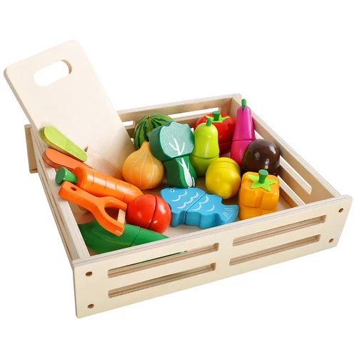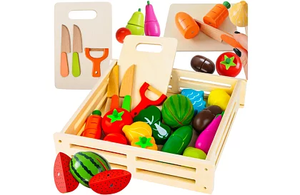 Setul colorat din lemn de fructe și legume oferă copiilor un joc distractiv de gătit, comerț sau gospodărie. Datorită execuției realiste, posibilității de tăiere și reatașare, copiii își dezvoltă în mod natural motricitatea, imaginația și abilitățile sociale. Jucăria susține creativitatea, învățarea culorilor, formelor și noțiunilor de bază ale numărării, oferind în același timp distracție semnificativă pentru ore întregi.