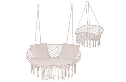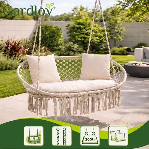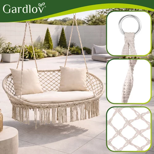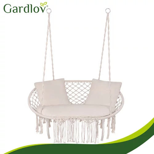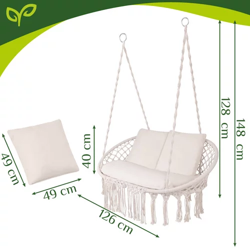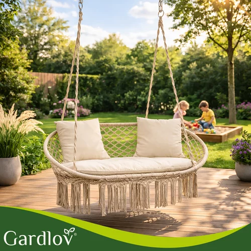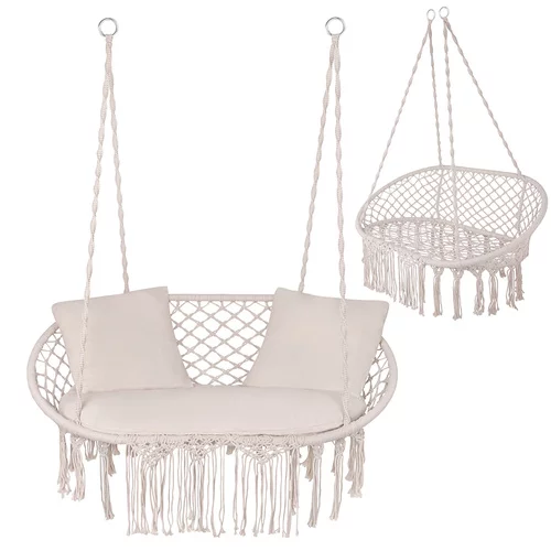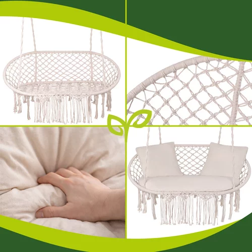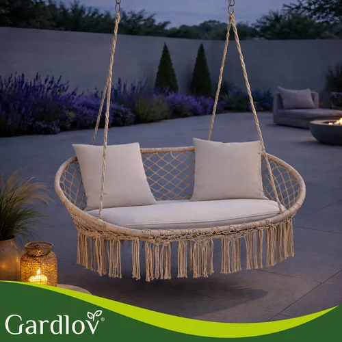 Un loc de relaxare confortabil pentru doi transformă grădina, terasa sau balconul într-un spațiu de odihnă și confort. Un fotoliu dublu spațios și perne moi permit o ședere confortabilă și o întindere ușoară, în timp ce cadru metalic solid și sfoară cu mânere metalice asigură stabilitate și siguranță. Un design boho aduce un element decorativ elegant, care completează orice spațiu exterior, iar opțiunea de suspendare variabilă permite adaptarea leagănului la nevoile personale.