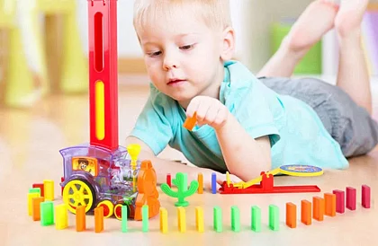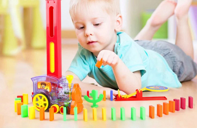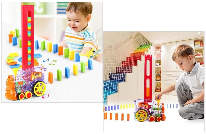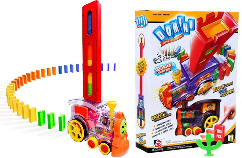 Această locomotivă domino este o jucărie excelentă pentru toți copii cărora le place să se joace cu trenulețe și dominouri, permițându-le în același timp să cunoască formele, să-și dezvolte gândirea logică și dexteritatea. Construiți un domino gigantic colorat cu ajutorul trenulețului simpatic. Trenulețul construiește din mers o șir de domino care poate fi apo frumos dărâmat.