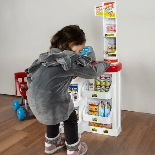 Un set de joc minunat, care simulează un supermarket adevărat și oferă copiilor ore de distracție și învățare. Setul combină o casă de marcat cu cântar, produse, rafturi și un cărucior, astfel încât copiii pot juca cumpărături singuri sau în grup. Sunetele și luminile realiste cresc atractivitatea jocului și susțin dezvoltarea imaginației și abilităților de joc de rol.