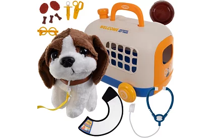 • Set complet de accesorii – stetoscop, foarfece, seringa, zgardă de protecție, bol, hrană și câine de pluș cu zgardă și lesă