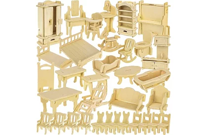 Mobilierul din lemn de calitate asigură utilizarea pe termen lung și rezistența în timpul jocului intens. Elementele de auto-montare cu margini șlefuite asigură o asamblare sigură și posibilitatea de a personaliza culorile conform dorințelor copilului. Mobilierul este de dimensiuni corecte, astfel încât să se potrivească perfect în diferite căsuțe pentru păpuși și să permită crearea unor interioare variate. Setul include echipamente complete pentru toate camerele și dezvoltă creativitatea și imaginația.