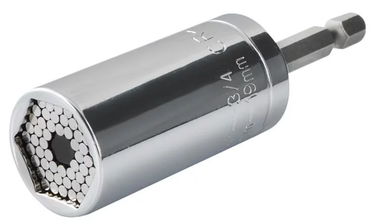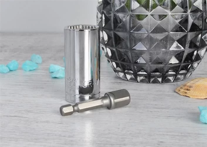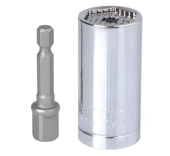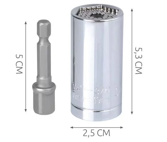 Acest adaptor este un instrument universal potrivit pentru șuruburi și piulițe hexagonale. Datorită barelor metalice speciale, se adaptează formei șurubului, ceea ce permite deșurubarea șuruburilor și piulițelor prelucrate sau deteriorate. Setul include un adaptor pentru fixarea cheii pe șurubelniță sau bormașină, ceea ce îi crește flexibilitatea și confortul în utilizare. Fabricat din oțel rezistent pentru o durată lungă de viață.