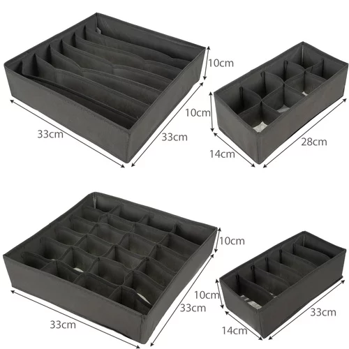 Set practic de patru organizatoare, care asigură ordine în sertarele și dulapurile dumneavoastră. Fiecare organizator este potrivit pentru un alt tip de lenjerie intimă și ajută la găsirea rapidă a ceea ce aveți nevoie. Datorită construcției pliabile și materialului respirabil, organizatoarele sunt confortabile, durabile și ușor de întreținut.