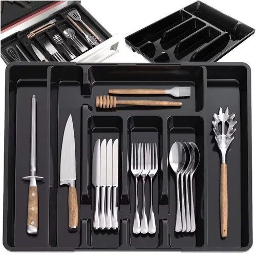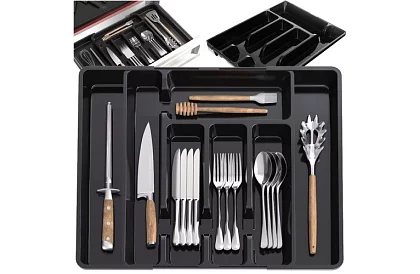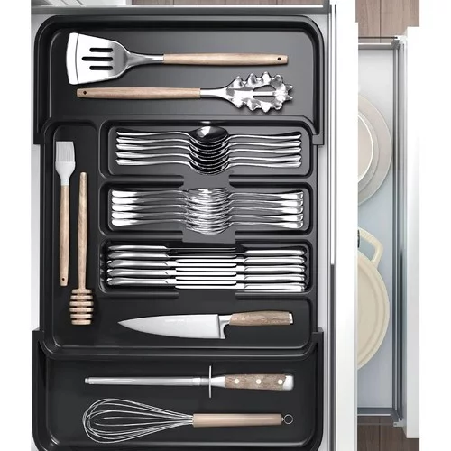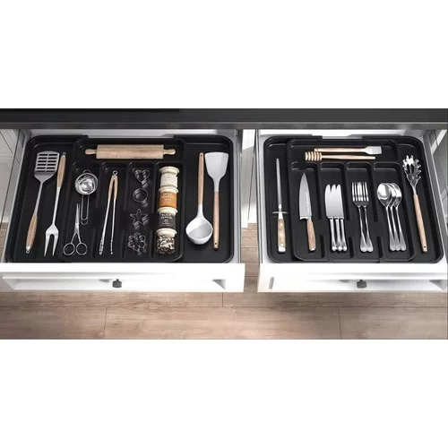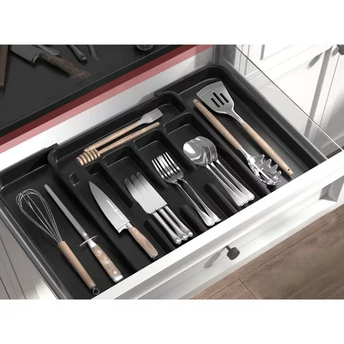 Organizatorul oferă maximă claritate și ordine în sertare, economisind timp în căutarea tacâmurilor și ustensilelor de bucătărie. Datorită mecanismului de extensie ajustabil, se adaptează la diferite lățimi ale sertarelor și poate găzdui toate tacâmurile și accesoriile. Designul negru elegant completează aspectul modern al bucătăriei, iar materialul rezistent garantează o durată lungă de viață.