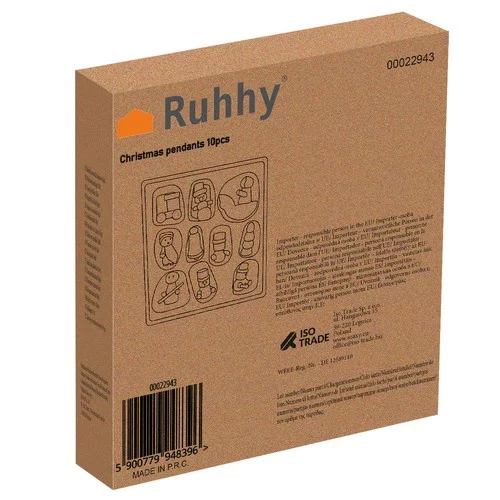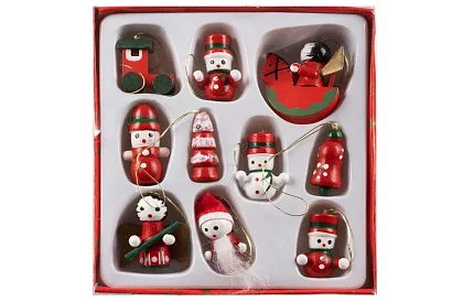 Set de zece pandantive din lemn aduce în aranjamentul de Crăciun o eleganță și farmec atemporal. Fiecare figură are un motiv de Crăciun unic – clopoțel, stea, Moș Crăciun, vagon și altele – și oferă bradului și decorațiunilor un aspect natural și stilat. Datorită materialului din lemn, ornamentele sunt rezistente, ușoare și potrivite și pentru familiile cu copii sau animale de companie. Pandantivele pot fi agățate de brad, perete sau folosite la crearea decoțiunilor de Crăciun.