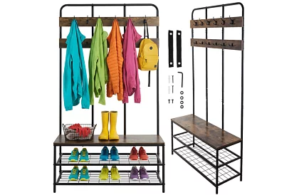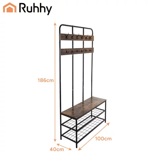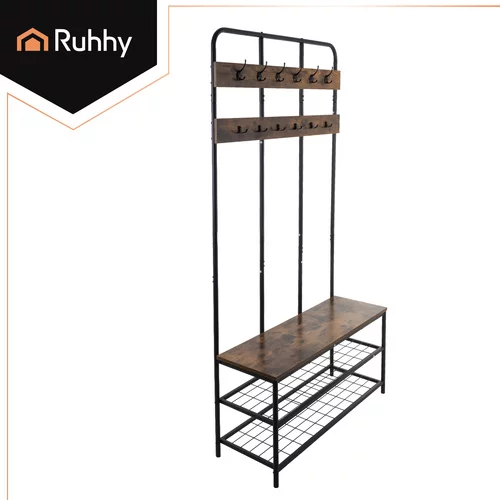 O soluție practică și elegantă pentru ordine și confort în hol. Oferă rafturi spațioase pentru pantofi, suprafață de șezut și 12 cârlige duble pentru jachete, paltoane și genți, astfel încât totul are locul său. O structură metalică robustă și accente din lemn în stil loft asigură durabilitate și un aspect modern. Datorită montajului simplu, poți să te bucuri de spațiul ordonat în câteva minute.