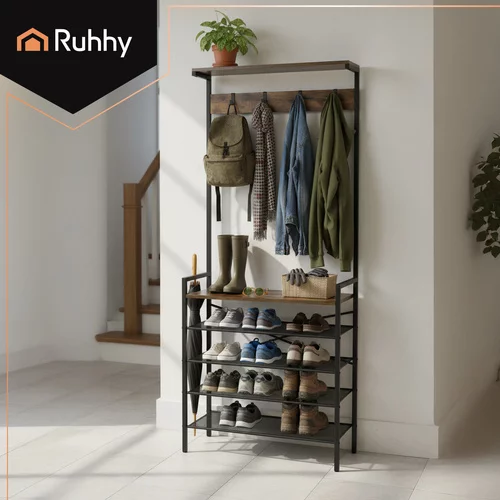 Peretele independent combină eleganța și funcționalitatea și ajută la păstrarea jachetelor, pantofilor și accesoriilor întotdeauna la îndemână. Cadru metalic robust asigură stabilitate, patru rafturi spațioase și cinci cârlige mențin lucrurile organizate și clare, în timp ce raftul superior oferă loc pentru pălării și eșarfe. Ideal pentru holuri, dressinguri și birouri.