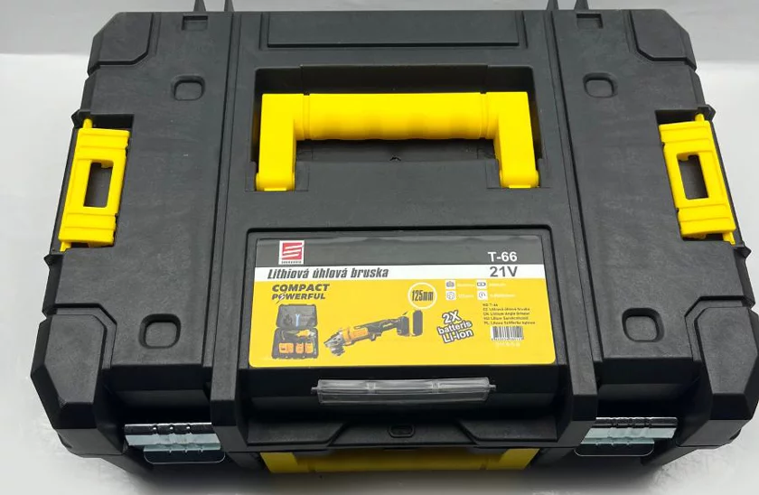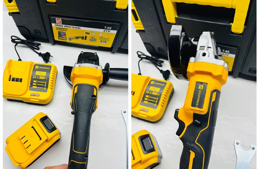 Polizor unghiular fără fir puternic și fiabil, cu accesorii într-o geantă practică. Bateria, cu tehnologia litiu-ion (Li-Ion) și cu indicator LED de stare, permite obținerea unei cantități de energie de două ori mai mare decât bateriile convenționale, păstrând același timp o greutate și dimensiuni similare. Designul ergonomic și corpul subțire și moale, fac ca această sculă să se prindă bine în mână și să facă munca mai confortabilă. Ușurează lucrările efectuate la înălțime sau în medii periculoase, unde nu există conexiuni la electricitate, dar nu numai acolo.