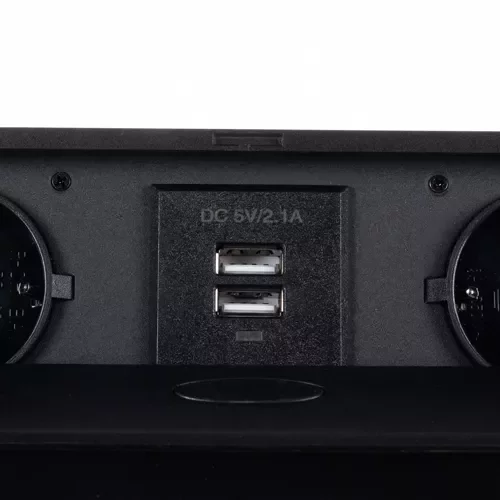 Priza de perete retractabilă combină două prize de alimentare clasice cu împământare de tip Schuko și două porturi USB de 2,1 A într-un carcasă elegantă și ascunsă. Datorită acesteia, puteți încărca cu ușurință telefonul, tableta sau conecta alte dispozitive electronice, fără a afecta aspectul biroului. Priza se extinde prin apăsarea unui buton și, după utilizare, se ascunde din nou – ideală pentru un loc de muncă modern și ordonat.