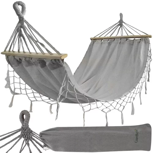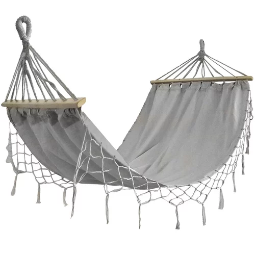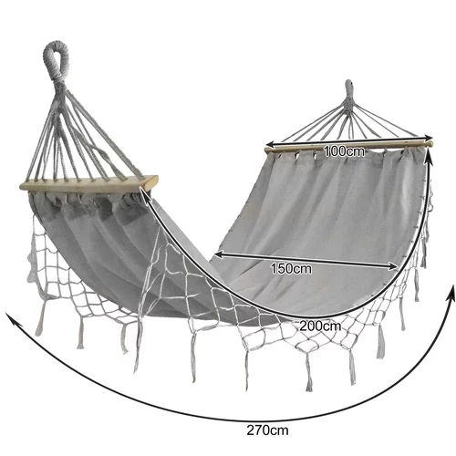 O rețea de hamac rezistentă și durabilă oferă un loc confortabil de odihnă pentru una sau două persoane. Barele din lemn masiv și sforile rezistente asigură o suspendare sigură, în timp ce materialul respirabil din bumbac și poliester oferă un loc de odihnă confortabil și durabil în grădină, pe terasă sau pe balcon.