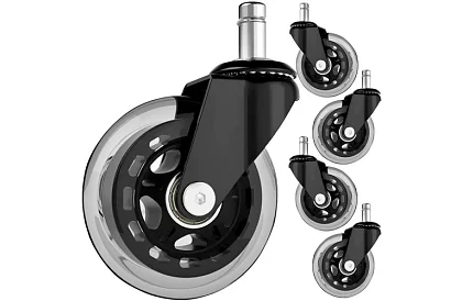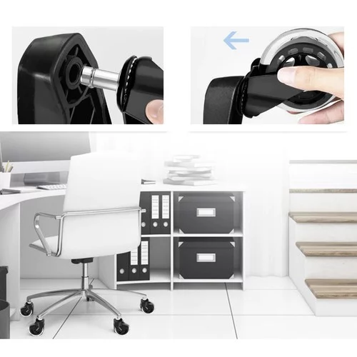 Setul de roti de schimb este ideal pentru scaune de birou, de joc, rotative și pentru copii. Fabricat din cauciuc de calitate, protejează podeaua de zgârieturi și asigură în același timp o mișcare silențioasă și lină a scaunului. Instalarea este ușoară datorită sistemului push-and-click, astfel încât în scurt timp puteți oferi scaunului dumneavoastră o nouă viață.