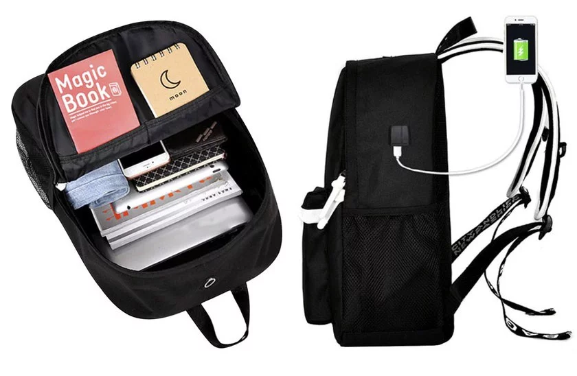 Multe buzunare + cabluri și lacăt – model practic și spațios. Pe partea din față are un buzunar cu fermoar, iar pe laterale două buzunare pentru sticle. Compartiment principal cu fermoar dublu + 4 buzunare mai mici (1 cu fermoar). În rucsac vei găsi un penar, cabluri USB și mini jack, precum și un lacăt cu cifru – perfect pentru școală sau călătorii.