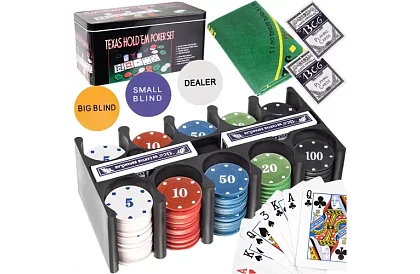 Setul aduce tot ce este necesar pentru a juca Texas hold'em și alte jocuri de cărți. 200 de jetoane cu construcție solidă și o greutate adecvată asigură o senzație profesională la fiecare joc. Masa de joc verde permite o experiență de joc confortabilă și realistă aproape oriunde, fără a ocupa mult spațiu. Suport pentru jetoane și cadru pentru cărți menține ordinea și protejează componentele individuale în timpul transportului.