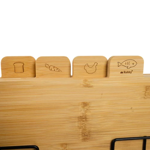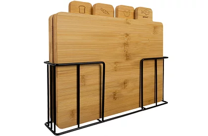 Facilitați pregătirea meselor și mențineți maxima igienă în bucătărie datorită setului practic de tăvițe din bambus cu marcaje clare. Fiecare tăviță este destinată pentru un alt tip de alimente, ceea ce ajută la reducerea transferului de mirosuri și bacterii. Materialul bambus natural este rezistent, se usucă rapid și nu absoarbe mirosuri nedorite. Suportul metallic elegant asigură o depozitare ordonată și economisește spațiu pe blatul de lucru. Setul este ideal nu doar pentru tăiere, ci și pentru servirea stilată.