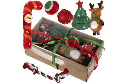 Bucuria de Crăciun pentru animalul dumneavoastră de companie! Acest set conține șase jucării atent selectate din materiale de calitate, care vor asigura distracție, stimulare și un joc sigur pentru câinele dumneavoastră. Jucăriile susțin activitatea fizică și psihică a câinelui și ajută, de asemenea, la prevenirea deteriorării mobilierului sau a altor obiecte din casă.