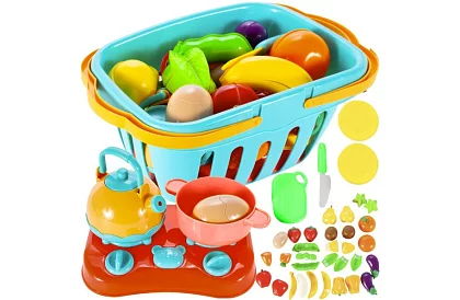Dezvoltați creativitatea și motricitatea copilului cu acest set colorat de legume și fructe. Piesele fabricate cu precizie îi atrag pe copii să se joace acasă sau în timpul "gătitului" în magazin, sprijină imaginația și permit tăierea și reasamblarea în siguranță cu ajutorul ariciului. Setul include, de asemenea, un coș și un mini aragaz pentru o experiență completă de joacă de bucătar.