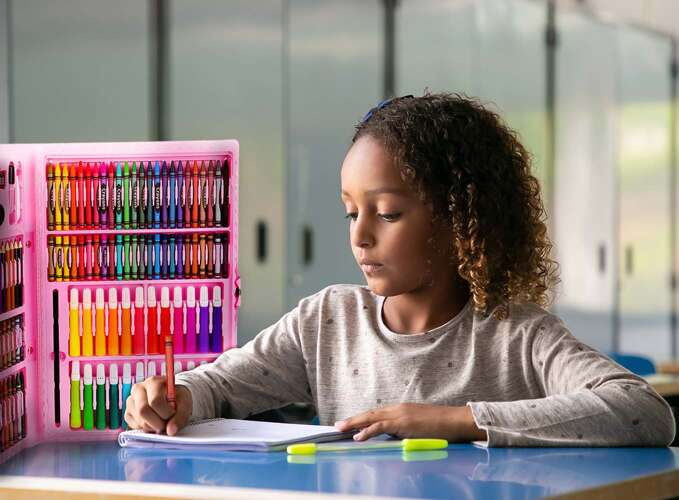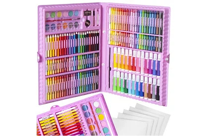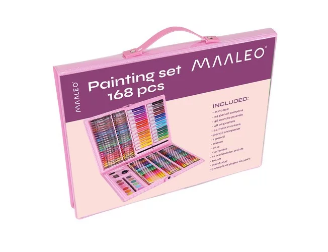 168 de elemente – setul conține 24 creioane colorate, 24 markere, 48 creioane de ulei, 48 creioane cerate, 12 culori acquarelle, o pensulă, o paletă de pictură, un ascuțitor, un creion, lipici, corector, radieră și 5 foi de hârtie A4, astfel încât copiii să poată crea cu ușurință cele mai creative și originale opere.